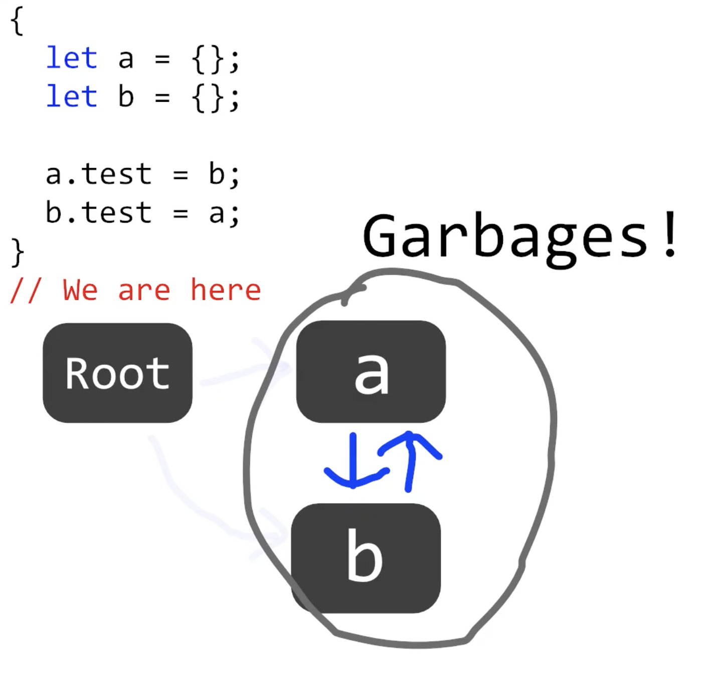 => 우측 하단과 같이 순환참조하는 객체를 가비지로 인식하고 스윕해준다.