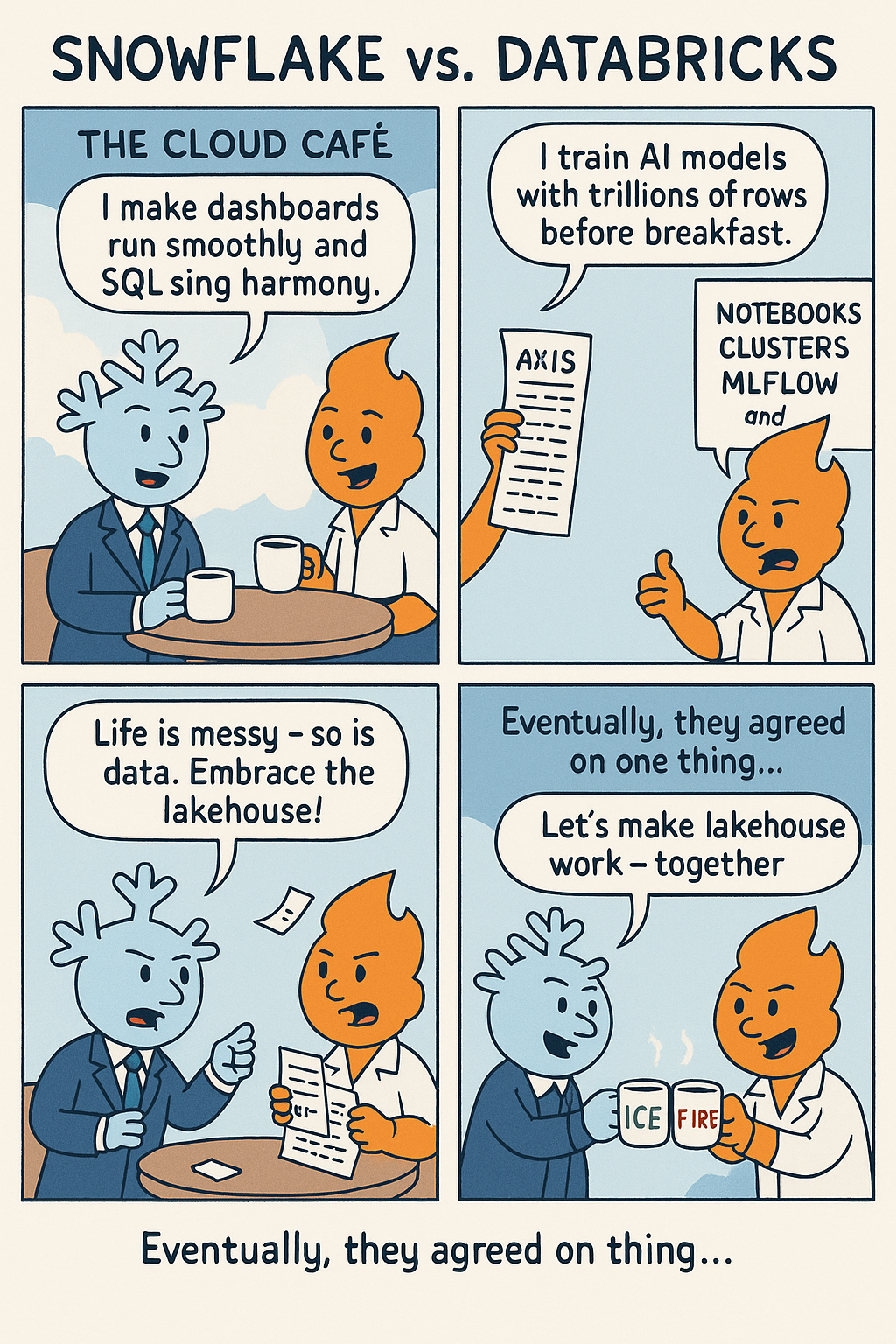| 데이터 거버넌스 | Snowflake-native <br/>(계정, 역할 기반) | Unity Catalog <br/>(레이크하우스용 통합 거버넌스 솔루션) |