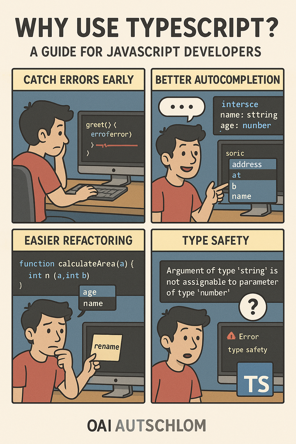 TypeScript는 이 문제를 근본적으로 해결합니다. 개발자가 함수의 매개변수와 반환 값의 타입을 명시적으로 지정하면, TypeScript 컴파일러가 코드가 실행되기 전에 오류를 잡아냅니다.