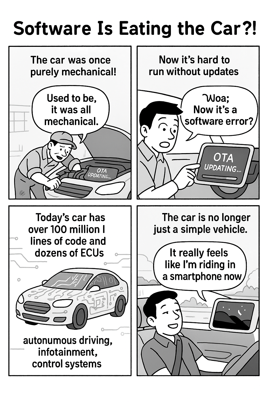 - 소프트웨어의 중요성: 최신 자동차 한 대에는 수백 개의 ECU(전자 제어 장치)가 탑재되어 있으며, 이 ECU들을 구동하는 소프트웨어의 코드 라인 수는 무려 1억 줄에 달하는 것으로 추정됩니다. 이제 자동차 제조업체들은 소프트웨어 업데이트를 통해 새로운 기능을 추가하거나 성능을 개선하는 OTA(Over-the-Air) 방식을 도입하고 있습니다.