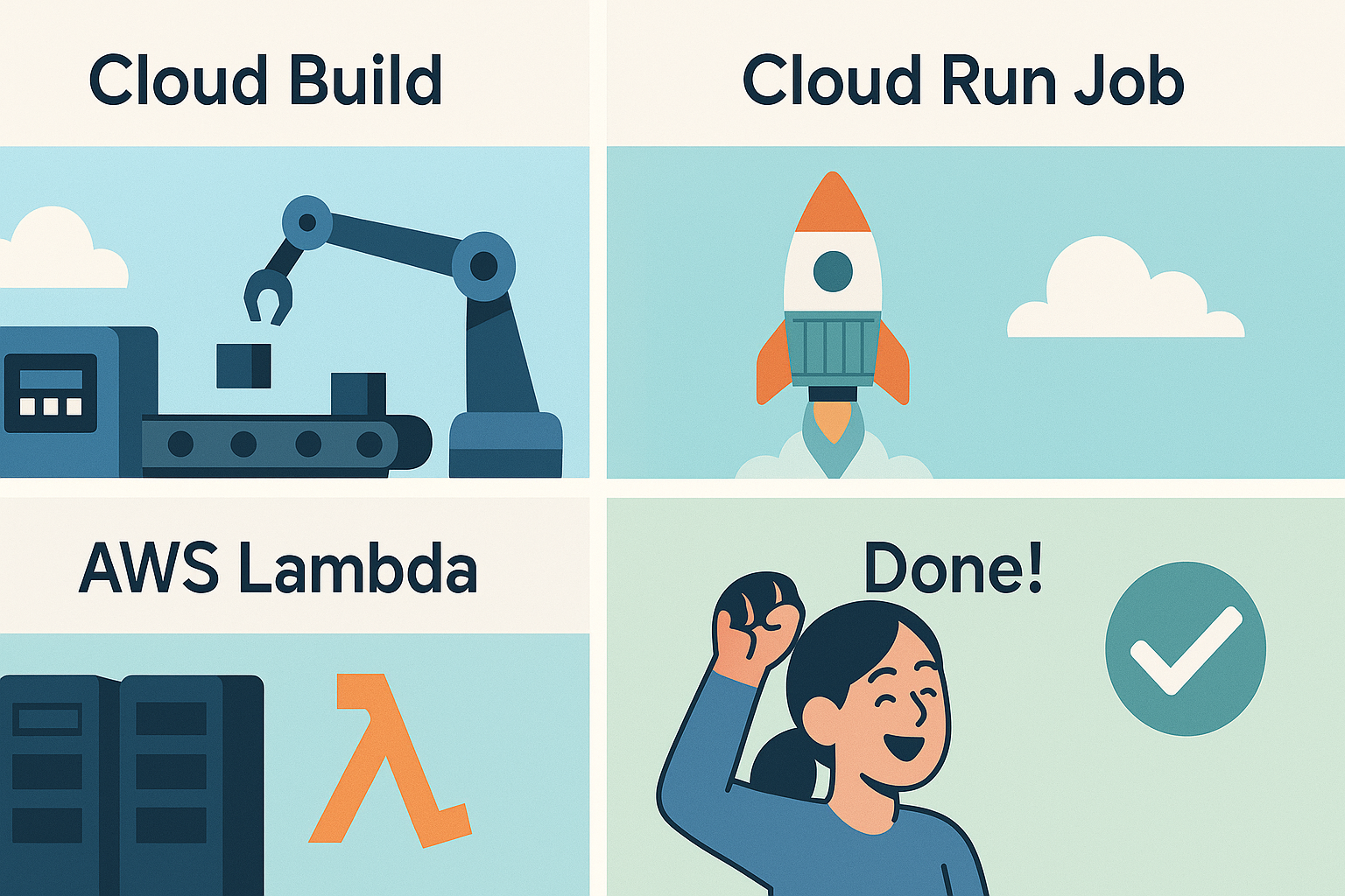GCP Cloud Build와 Cloud Run Job을 활용한 파이프라인 구축은 AWS CodeBuild와 Lambda를 사용하는 것과 유사하지만, 몇 가지 중요한 차이점을 갖는 현대적인 CI/CD(지속적 통합 및 배포) 전략입니다. 두 플랫폼의 장단점을 이해하면 워크로드에 가장 적합한 도구를 선택하는 데 도움이 됩니다.