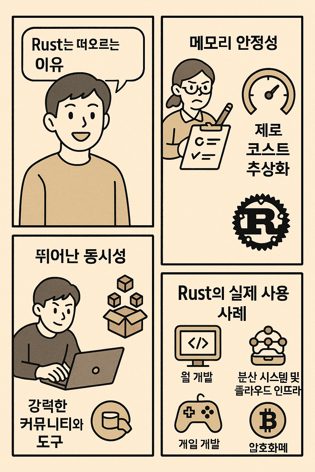 - 강력한 커뮤니티와 도구: Rust는 Cargo라는 강력한 패키지 관리자와 빌드 시스템을 기본으로 제공합니다. Cargo는 의존성 관리, 테스트 실행, 문서 생성 등 개발의 모든 과정을 간편하게 만들어줍니다. 또한, 친절하고 상세한 공식 문서(The Rust Programming Language)가 있어 학습 접근성이 매우 좋습니다. 활발한 커뮤니티는 Rust의 성장을 더욱 가속화하고 있습니다.